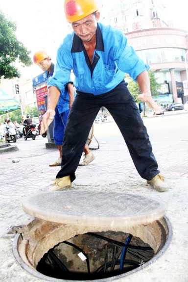7月29日,中国移动通信集团浙江有限公司黄岩分公司的员工正在横街路的地下管道进行网络线路铺设工作,着力实施"全覆盖"工程,打造移动通信精品网。连日来,黄岩连续出现30摄氏度以上的高温天气,许多户外劳动者冒着酷暑高温坚持工作。据了解,有关部门已经通过增加岗位轮换频次、增加午休时间、错时上下班等方式防止户外人员出现高温中暑现象。