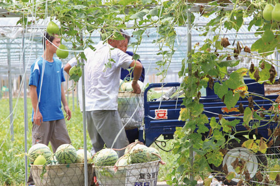 4日上午,院桥瓜农抢收成熟的西瓜,装上农用三轮车运走。
