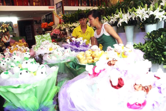 8月4日,笔者看到一家花店员工正忙着准备“七夕”销售的小熊花束。距“七夕”还有两天,但精明的商家已提前行动起来,开始积极备货,打算在这个浪漫的传统节日里掘一桶金。