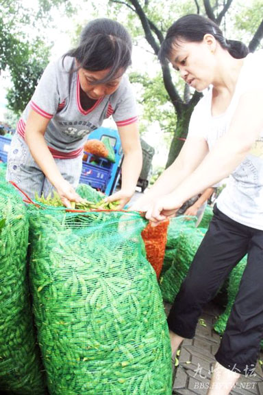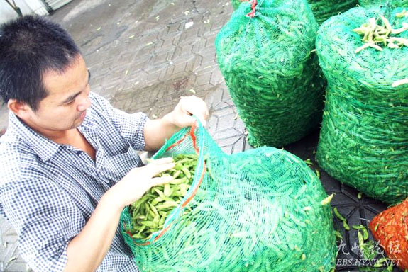 8月31日下午,很多市民正在黄岩农贸批发市场门口抢购温州毛豆。据了解,由于我区毛豆还没有上市,所以温州毛豆提前抢占了我区的市场,现在每公斤毛豆批发价在5.8元左右,这让温州豆农喜上眉梢。