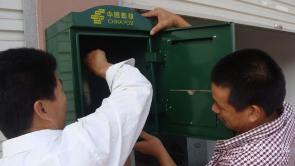 北城街道村级邮政站建设正在有序推进中,图为工作人员正在塔水桥村挂邮政信箱。