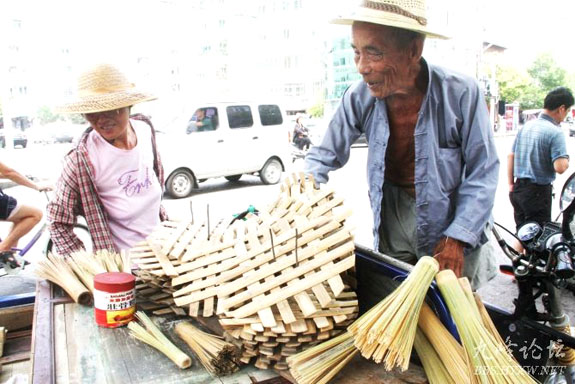 9月15日上午,一位来自临海的老人在天长北路卖自制竹厨具。由于竹制品比较环保,再加上价格也非常便宜,所以还是受到部分市民的欢迎。
