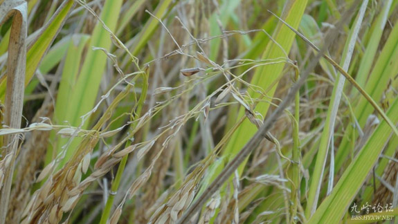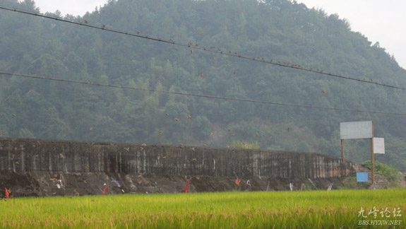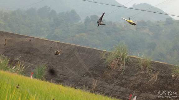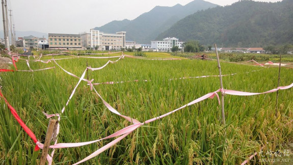 10月17日,笔者在黄岩西部山区宁溪镇看到,当地田野间遍布稻草人,还用塑料泡沬、彩色布条、破旧晴雨伞、空漆桶等等遍插田头地角。据了解,现在山区竹木茂盛,生态环境越来越好,麻雀也越来越多,稻谷,高梁等庄稼受到严重危害,于是农民就在田里插稻草人,扎尼龙纤维等方法驱赶鸟雀。