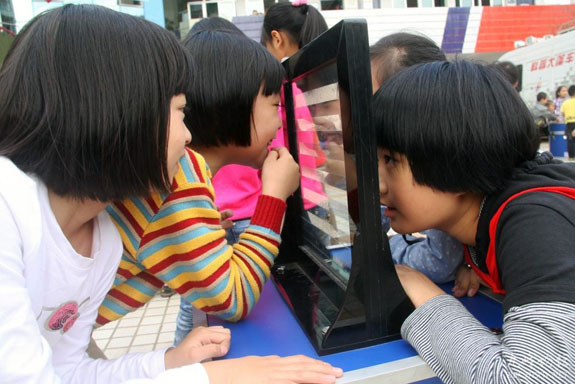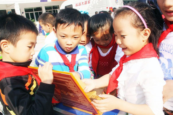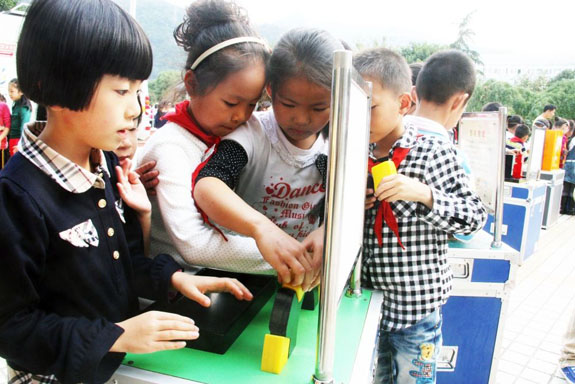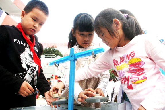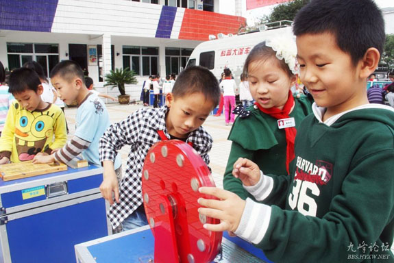 10月18日,科普大篷车进入东城街道中心小学,操场上几名同学正在玩“华容道”。据悉,我市通过“科普大篷车进校园”、“科普知识一日游”、“科普知识展板”等多形式的科普套餐活动,让全市中小学生切身体会科技的魅力和力量,有效地激发他们爱科学、学科学、用科学的兴趣。