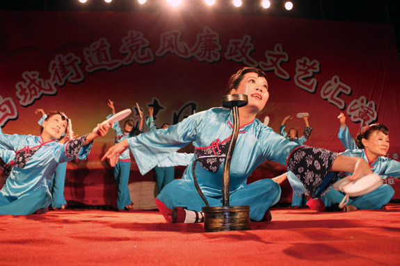 10月18日晚上,西街社区篮球场内欢声笑语不断,西城街道组织的党风廉政文艺汇演给该社区的居民们带来了一顿“文艺大餐”。图为演出现场。