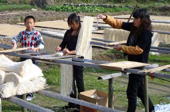 11月13日,在西部山区宁溪镇,一群农家女正在自家门前空地上把晾干的麦面收起来,并进行整理包装,以便日后随时可以食用。据悉,在我区西部乡镇宁溪、富山、头陀等地还保留着自家做年糕、做面等习俗。