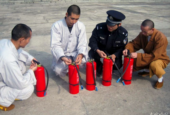 11月15日上午,院桥派出所组织民警来到院桥镇广化寺开展消防安全检查。检查中,民警现场讲授灭火器、消防栓的使用及开展灭火现场演练,切实提高僧人消防安全意识和防火扑救能力。图为民警正在讲解传授使用灭火器的正确方法。