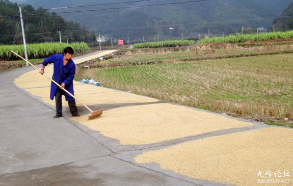 11月20日,久雨初晴,宁溪镇各地群众忙着晾晒堆积的新谷。由于上阶段下雨,当地群众收获的大量谷子堆积家中,有的管护不当甚至还发了芽。当天清晨,人们都忙着把谷子运出去晾晒,但由于晾晒场地缺乏,田里又有积水,人们只好晾晒在房前屋后、防洪坝顶、公路两旁。稻谷未收获时与鸟争,收获后又与天争,农民为了夺取维持生命和稳定社会基础的口粮真辛苦。