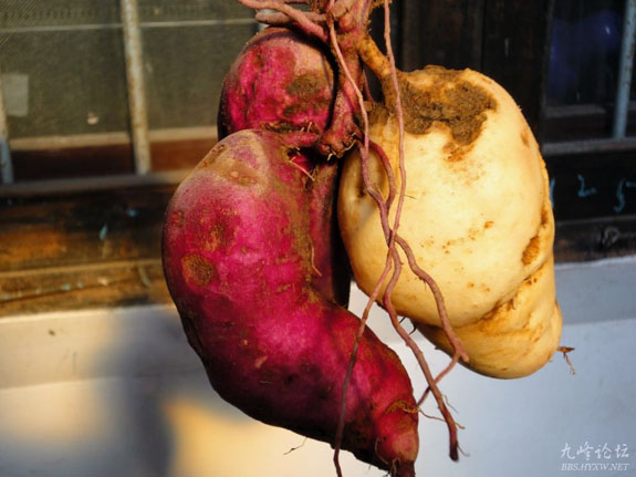 11月23日,富山乡双坑村张邦银挖番薯时,发现有一棵番薯苗结出了两种颜色的果实。这棵苗共生了三块果实,其中两块是紫色的,一块是乳白色的,吸引了许多群众前来观赏,都说从没有见过这样的事情。