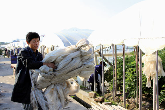 11月23日,在院桥镇繁荣番茄种植基地里,茄农忙着为番茄大棚加盖薄膜,以免降温造成番茄冻伤。我国的传统节气小雪过后,气温也将持续走低,连日来,该镇农户纷纷着手为农作物“添衣加被”,做好前期防冻准备,以便农作物安全越冬。
