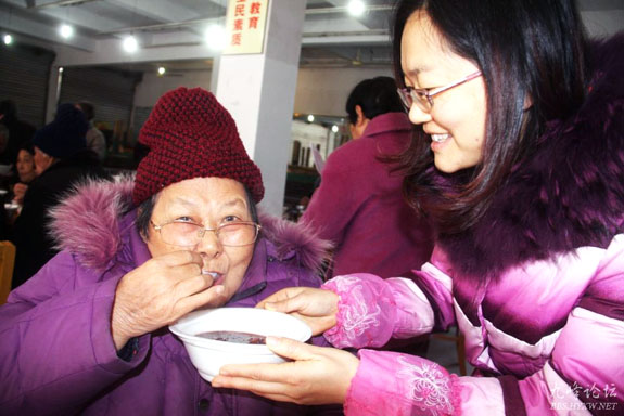 今年的腊八节和元旦是同一天,12月30日上午,东城街道海棠社区工作人员和黄岩慈善义工将熬好的两大锅热气腾腾的腊八粥搬到社区活动中心,将一碗碗腊八粥送到每一位老人手中,品尝着美味的米粥,老人们都赞不绝口。