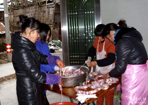 1月15日,茅畲乡西边、下街等村妇女们正在一起制作香肠。随着春节的临近,茅畲乡家家户户忙着晒制香肠、腊肉、做年糕、打肉丸、鱼丸等客家特色美食,节日的气息,随着这种农户家风情一天比一天更加浓郁了。