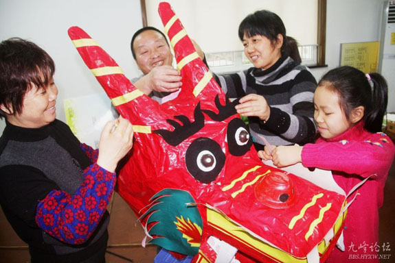 1月31日,山亭社区的居民们正在精心制作大型龙年龙灯。新年元宵节期间,东城街道各村(社区)将举行猜灯谜、包汤圆、文艺演出和制作环保灯笼等一系列活动,届时将会让广大市民感受到融融的传统节日氛围。