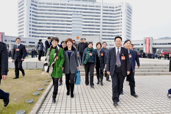 昨天下午,市四届一次党代会圆满闭幕,出席此次会议的黄岩党代表步出会场。