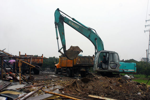3月19日上午,一台挖掘机正在西城街道霓桥金村清理垃圾和杂物。当天,西城街道和公安、国土、城管等多个部门联合执法,对霓桥金村的几处违法建筑进行集中拆除。