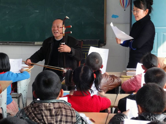 3月22日,宁溪镇中心小学聘任的民间音乐教师王小飞先生正在为学生上课。历史悠久的古镇宁溪,大型丝竹铜锣乐曲《作铜锣》等等非物质文化遗产资源丰厚。该校为了全面推进非物质文化遗产的保护和传承工作,今年特地开设了民族民间音乐课,聘任省、市、区民间文艺家协会会员,退休文化干部王小飞先生为老师,长期为学生传授当地各种精彩的传统民间音乐。