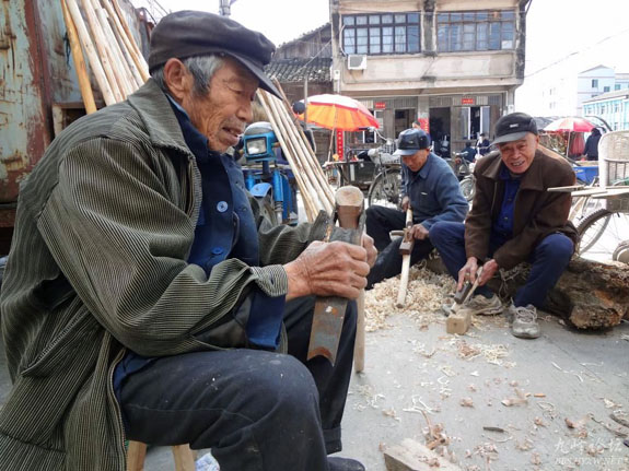3月26日,头陀镇集市街头木工师傅正在现场为农民伯伯制作农具。每年春耕备耕时节,他们做的锄头、扁担、簸箕、斗笠等传统农具卖得特别畅销。