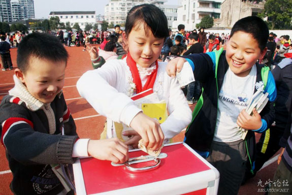除了义卖书籍,在操场南面的空地上还摆放着一只红色的捐款箱,“红领巾”们在推销货物的同时,不忘提醒大家为患病儿童献爱心。一张张纯真的面孔和一声声稚嫩的吆喝背后,是一颗颗火热的心,不少小“顾客”和老师都乐呵呵地慷慨解囊。