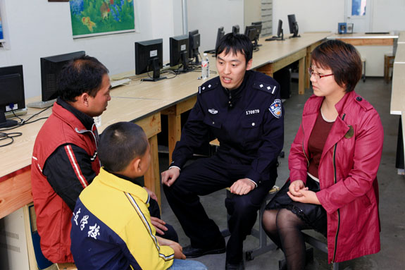 4月17日,黄岩公安分局城北派出所民警和三友民工子弟学校老师正在和贵州籍的李家胜父子谈话。两年前,李家胜因吸毒被强制戒毒,他7岁的儿子无人照料,黄岩警方和三友民工子弟学校及时伸出爱心之手全力照顾其儿子,使他健康成长。李家胜回到黄岩后,对社会各界对他儿子的照顾万分感谢,表示要远离毒品,好好生活。