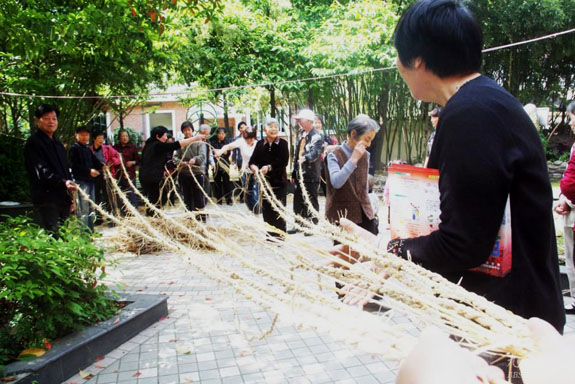 居民搓稻草绳比赛迎五一