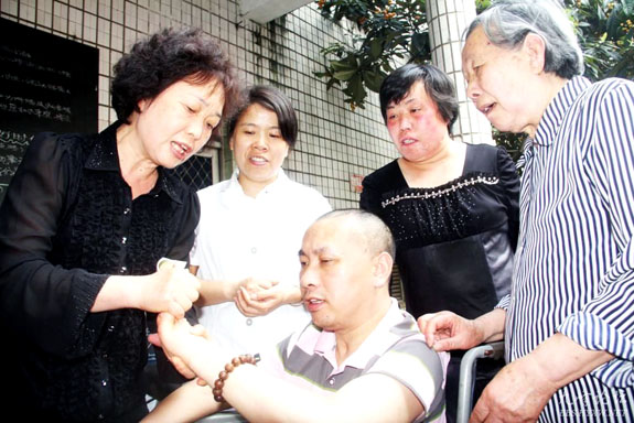 5月18日下午,东城街道海棠社区举行了“让残疾人健康起来”健康知识培训活动。本次活动包括向他们宣讲了残疾人康复政策和康复知识、康复指导等,同时还为30多名残疾人赠送了生活用品,并鼓励他们树立对生活的信心,积极接受治疗,进行康复训练。图为社区医生正在指导残疾人家属进行正确训练。