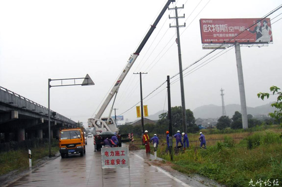 电力工人架设线杆忙