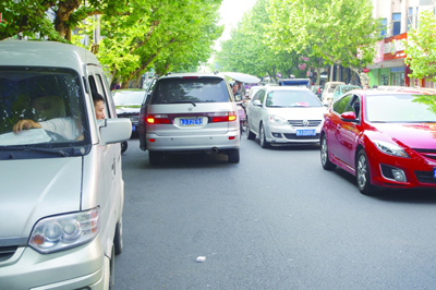 天长南路,一辆商务车逆行停在马路左侧(机动车应靠右行驶)下客,占去1/3路面,形成堵塞。