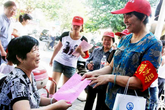 7月2日上午,东城街道山亭社区10多位党员志愿者头戴小红帽,别着红袖章,自发的来到天长路,和行政执法人员、交警一起,维持环境交通秩序。志愿者们一边走,一边向行人和商家分发市容和环境卫生管理宣传资料,遇到市民提出疑问,他们就耐心的向他们宣传解说。同时还和商家签订了责任状,希望他们能自觉遵守责任书里的相关规定。