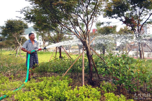 7月15日,宁溪镇园林工人忙着抽水浇灌花草树木。该镇开展“清洁家园和谐村居”活动以来,建造了多个公园及许多绿化设施。连日高温,烈日把花草树木都快烤焦了。当天一大早,园林工人按时又给饥渴难耐的花草树木送清凉。