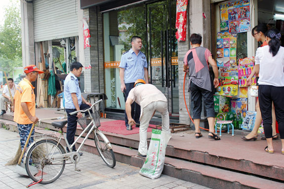 7月18日上午,区城管行政执法分局联合区环卫部门对塔院头路进行集中清理和整治。在执法过程中,执法队员对越门经营、占道经营、车辆乱停放等违章行为进行劝导与整治,依法拆除各类有碍市容市貌、未经审批的广告、灯箱和横幅,清理店面门口的木板和石块等物品。