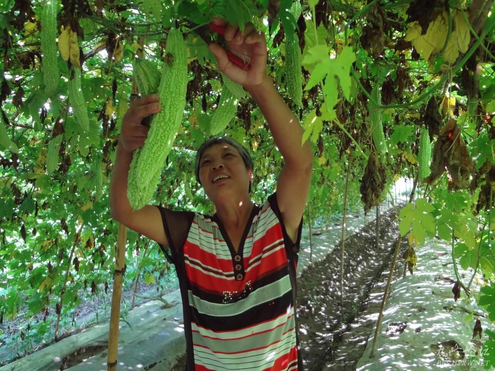 苦瓜肉质脆嫩,清香可口,在医药上有促进饮食、清心明目、利尿活血、清凉解毒等疗效,因此,夏日苦瓜深受市民欢喜,价格也一路攀高,目前当地收购价每公斤在5元左右。图为8月20日,头陀镇小里灰村种植户老马正在大棚里采收成熟的苦瓜。