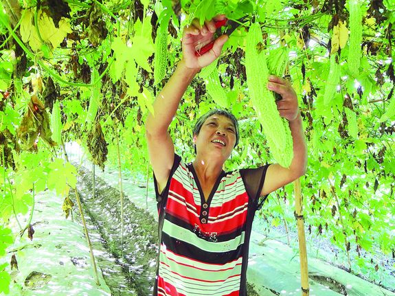 苦瓜肉质脆嫩,清香可口,在医药上有促进食欲、清心明目、利尿活血、清凉解毒等疗效,因此,苦瓜深受市民欢喜,价格也一路攀高,目前当地收购价每公斤在5元左右。图为近日,头陀镇小里灰村种植户老马正在大棚里采收成熟的苦瓜。