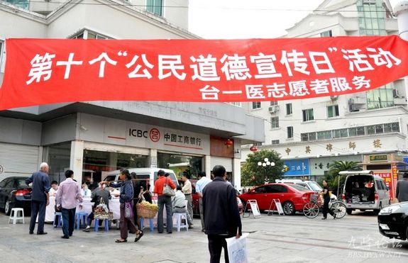 9月20日上午,台一医志愿者服务队在黄岩横街路口举行义诊活动,以“带给百姓健康理念”的方式庆祝第十个公民道德宣传日的到来。