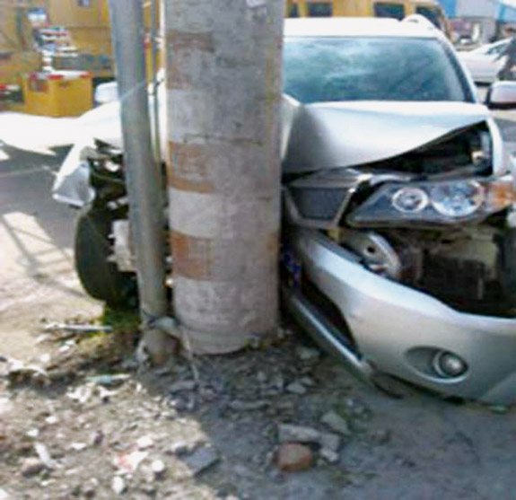 10月5日上午,在天元路与兴东路交叉口发生一起交通事故,一辆轿车与路边的电线杆发生碰撞,车头严重变形。据有关目击者称,该路口人流车辆较多,当时,兴东路上突然驶出一辆电动车,由于轿车行驶速度过快,来不及刹车,一头就撞上了电线杆。