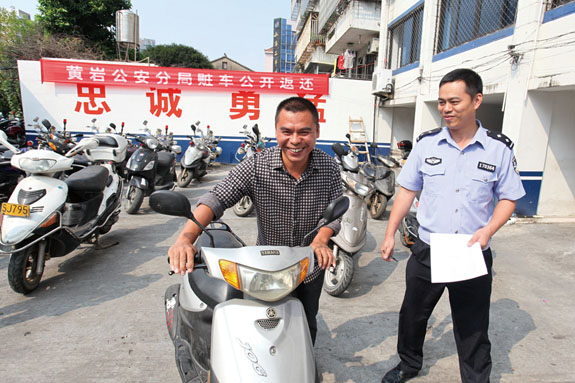 10月10日上午,一位市民在黄岩公安分局巡特警大队领回自己被盗的摩托车后,开心地笑了。黄岩巡特警大队认真分析盗窃摩托车、电瓶车案件的作案特点开展行动,半个月内追回赃车24辆,全部发还给失主。