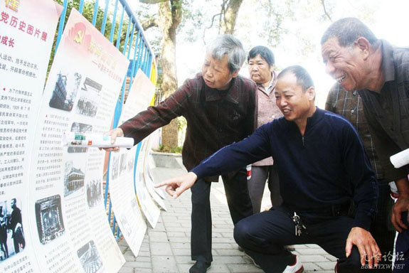为迎接党的十八大胜利召开,10月22日上午,桔乡社区举行了“回忆辉煌党史,喜迎十八大”党史图片展活动。活动中,社区展出了15张党史知识图片,让广大社区居民一同回顾党的一大到十七大的辉煌历程,深刻感受中国共产党带领全国各族人民共同奋斗取得的伟大成就,深知今天的幸福生活来之不易,坚定永远跟党走的信心和决心。