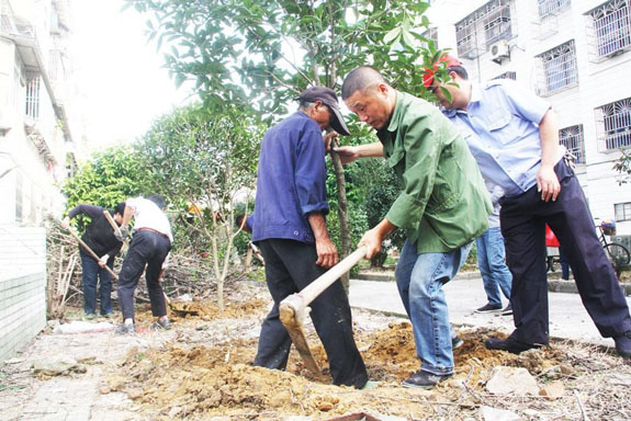 为了迎接省卫生城市复审,东城街道把本周确定为卫生突击周,要求各村(社)全面开展卫生大扫除、大整治、大清淤活动,打响“创建省级卫生城市”迎检冲刺战役。图为10月23日下午,海棠社区组织志愿者正在开展绿化带补绿和卫生大扫除活动。