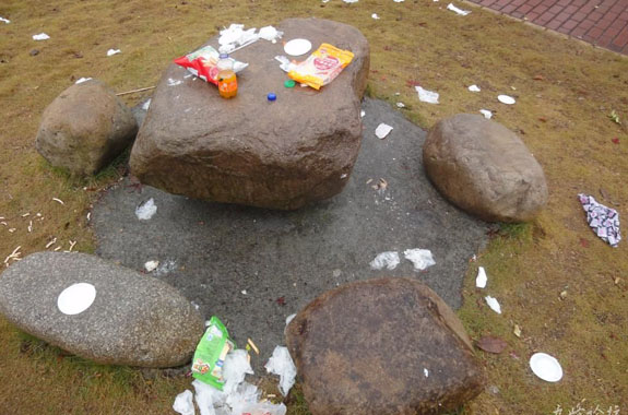 12月17日,在宁溪镇沿溪景观带,好多晨练群众围着一简易石桌凳议论什么。原来这里到处都撒满了垃圾,看来是有人围坐吃喝没有清理造成的。人们纷纷指责有些人挑干净环境吃喝玩赏,却留下大量垃圾。笔者认为公园环境要靠大家共同保护,无论男女老少都一样,自己产生的垃圾完全可以轻而易举地放进附近垃圾箱。