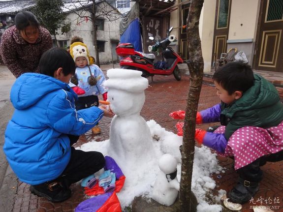 10月4日夜下了大雪,次日早晨宁溪镇的小朋友见了积雪喜出望外,他们打雪仗、堆雪人,玩得兴高采烈。宁溪虽说地处黄岩西部山区,但由于近些年来地球气候改变,已多年未见积雪了。图为小朋友们正在堆雪人。