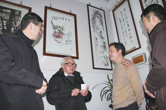 2月17日至21日,黄岩永宁书画馆举办2013新春书画作品展。开展当天,前来观展的书画爱好者络绎不绝。图为馆长金也(右二)与罗启松(右三)等书画家在作品展现场交流书画创作心得。