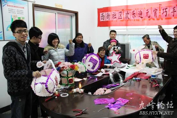 彩纸、鲜花、剪刀、铁丝、灯泡、棉花,2月22日下午,西街社区办公室的桌上摆满了各种制作工具,来自该社区的居民正忙着制作各式灯笼。白兔灯、花篮灯、五星灯,不一会,各种色彩鲜艳,形态逼真的灯笼在居民的巧手之下,新鲜“出炉”了。