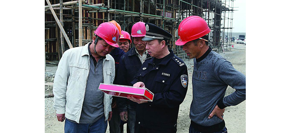 自黄岩公安分局开展“扫毒害保平安”专项行动以来,在严厉打击吸毒贩毒行为的同时,大力开展禁毒知识的宣传。图为3月19日,江口派出所民警在建筑工地利用毒品仿真样品向工人们开展禁毒宣传。
