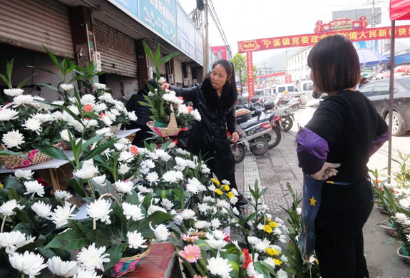 3月31日,宁溪镇市场上购买花篮祭祖的群众络绎不绝。该镇摒弃传统烧纸钱、点香烛等明火祭奠方式,提倡鲜花祭祖。近期,当地市场平时销售其他百货的店铺均征来大量鲜切花兼营业,以满足群众需要,大山里劲吹文明祭祖新风。