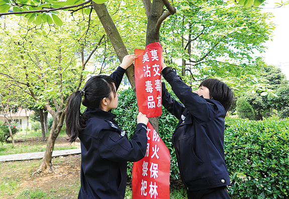 清明节前夕,为提高民众防火意识,黄岩公安分局组织民警在辖区的各上坟必经地、各社区的小树上挂上“文明祭祀、防火保林”、“莫沾毒品、莫交毒友”等宣传资料,提高民众的防范意识。图为4月2日该局城东派出所民警正在挂宣传资料。