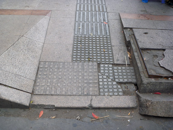 日前,有群众向记者反映,台一医报刊亭边上的台阶损坏严重,经常有市民不小心在这里摔跤。在现场,记者看到台阶右侧路面缺损严重,露出了内部的三角铁,希有关部门及时修复。