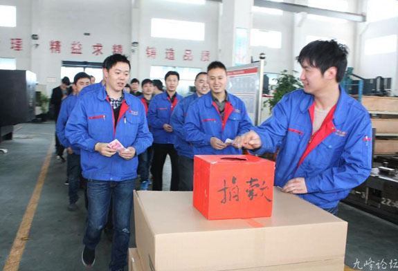 4月23日上午,黄岩坤泰模具有限公司车间内爱心涌动,全体员工在企业老总的带领下纷纷慷慨解囊,为四川雅安地震灾区伸出援助之手……短短几分钟时间,捐得善款15849元,他们用爱心为灾区人民带去一份安慰。