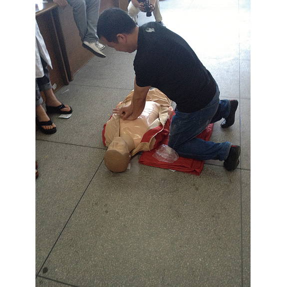 近日,新前街道办事处举办了急救知识培训。来自该街道机关、企事业单位和27个村居的应急志愿者共计100余人参加了培训。培训采用图文资料结合现场演示,详细地讲解了心绞痛、脑卒中等心脑血管疾病发作时的救护方法,以及在车祸、溺水等突发事件中怎样自救和互救常识。图为学员在台一医卢群医师的指导下进行了心肺复苏操作训练。