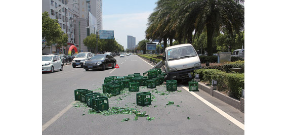 7月8日中午,在世纪大道广电大楼前,一辆满载啤酒箱的小货车冲上了隔离带,事故现场散落着不少玻璃瓶渣,在阳光的炙烤下地面散发着浓浓的啤酒味。小货车司机回忆说,当时他跟着一辆大货车,想从边上超车,却突然发现前方隔离带上冲出个女人。货车司机只能让自己的车冲上了隔离带,幸好没有伤到那个行人。