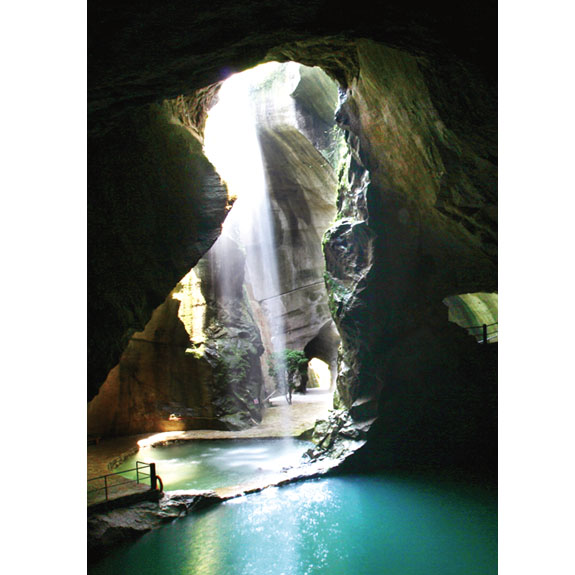 黄岩石窟位于江口街道山下郎村,是一处历经千百年形成的采石胜景。石窟内洞洞相连,碧水蜿蜒,洞天泛舟,别有意境;石壁上神奇的斑斓“岩画”遍布,如锦似绣。景区融合山水景观、帝王雕塑、采石文化为一体,让游人在轻松愉悦地游览中了解历史,感受美景。图为“洞庭”观瀑。