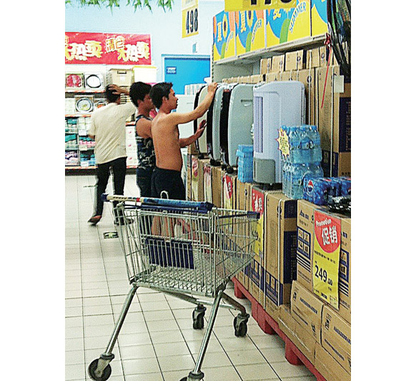 近来天气炎热,在各大商场的电器销售专区,记者看到在挑选电风扇、空调扇、空调的市民是络绎不绝。据悉,每年七八月份都是各大商场销售电风扇、空调扇等商品的旺季。图为市民正在选购空调扇。